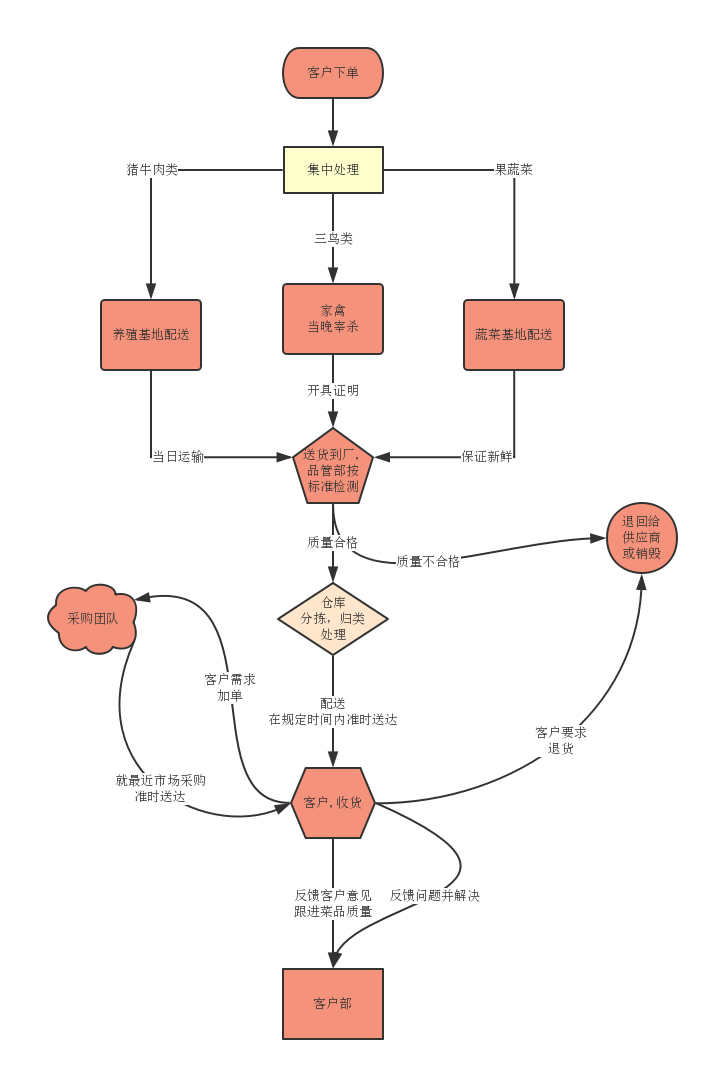 簽訂合同→確認(rèn)價(jià)格→下訂單→組織貨源→分揀稱(chēng)量→按照客戶要求處理產(chǎn)品→配送→驗(yàn)收→服務(wù)反饋→結(jié)算